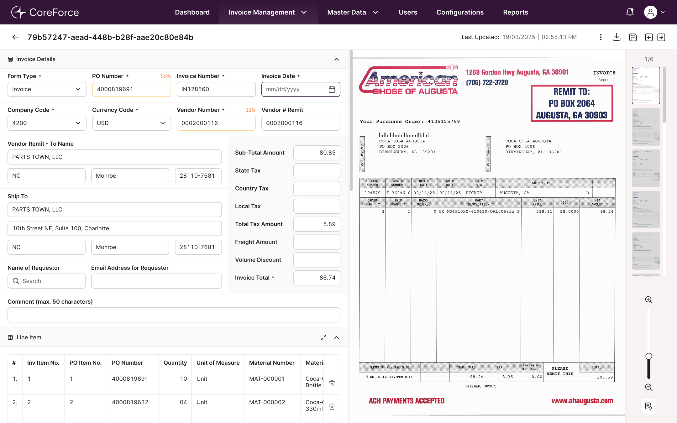 Using an intuitive, natural language-capable AI engine, CoreForce intelligently captures and validates key data points. Each data field is validated using your master data, flagging anomalies, verifying suppliers, and ensuring Tax compliance.